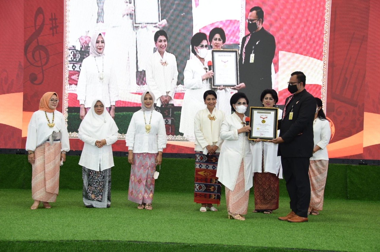 Penyerahan Rekor Muri diberikan secara langsung oleh Awan Rahargo mewakili Jaya Suprana kepada Ketum Dharma Pertiwi Nanny Hadi Tjahjanto didampingi Ketum Persit Kartika Chandra Kirana Ny. Hetty Andhika Perkasa, Ketum Jalasenastri Ny. Vero Yudho Margono dan Ketum PIA Ardhya Garini Ny. Inong Fadjar Prasetyo