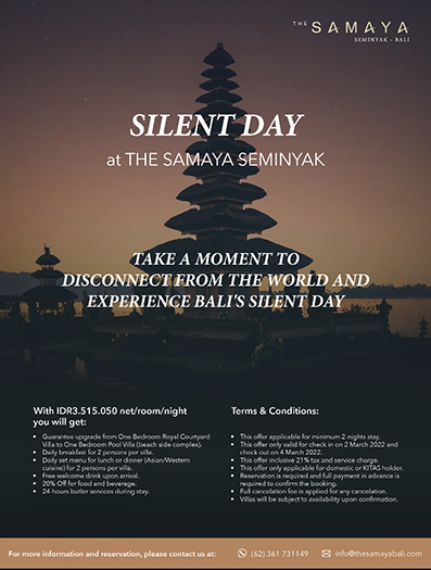 Paket Hari Raya Nyepi The Samaya Seminyak saat ini menerima pemesanan untuk satu kamar tidur Royal Courtyard Villa eksklusif untuk masa inap dari hari Rabu tanggal 2 Maret 2022 hingga hari Jumat tanggal 4 Maret 2022 (3 hari 2 malam). Setiap vila dirancang dengan sempurna untuk pasangan, berbulan madu, keluarga, dan rombongan, juga dilengkapi dengan kolam renang pribadi, gazebo bersantai, ruang tamu di area luar yang luas, dan kamar mandi dalam yang luas. Memberikan pengalaman Samaya yang mewah kepada para tamu yang berakar pada keramah-tamahan tradisional Bali, dan juga jaminan privasi di dalam kompleks mewah yang dirancang secara modern.