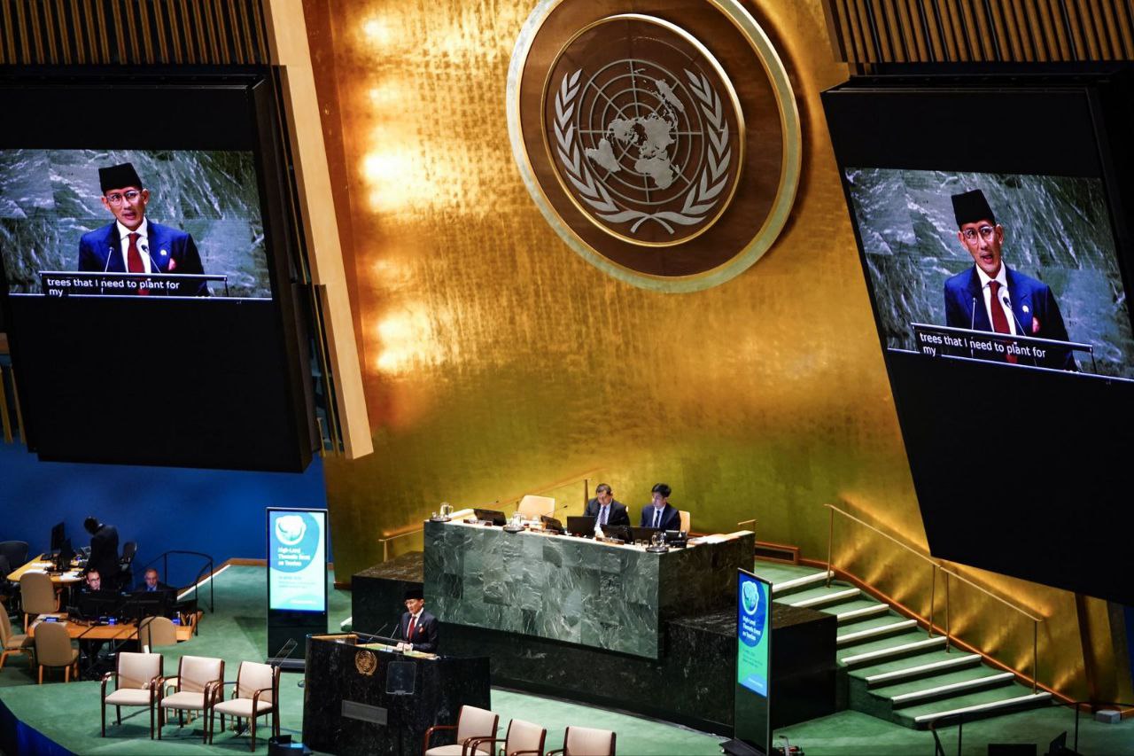 Menparekraf Sandiaga dalam pernyataannya di Markas PBB, New York, Amerika Serikat, Minggu (15/4/2024) menjelaskan upaya Indonesia dalam mentransformasikan pariwisata menuju pariwisata berkualitas dan berkelanjutan, juga pariwisata yang fokus terhadap peningkatan kesejahteraan masyarakat dengan beberapa produk pariwisata seperti desa wisata juga eco tourism.
