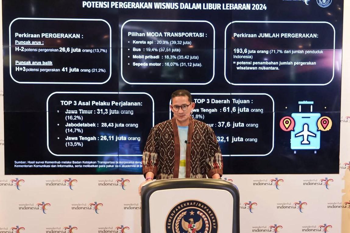Menparekraf Sandiaga dalam “The Weekly Brief With Sandi Uno”, Rabu (13/3/2024), mengungkapkan pergerakan masyarakat secara nasional atau wisatawan nusantara selama libur lebaran tahun ini berpotensi mencapai 71,7 persen dari jumlah penduduk Indonesia atau sebesar 193,6 juta orang.