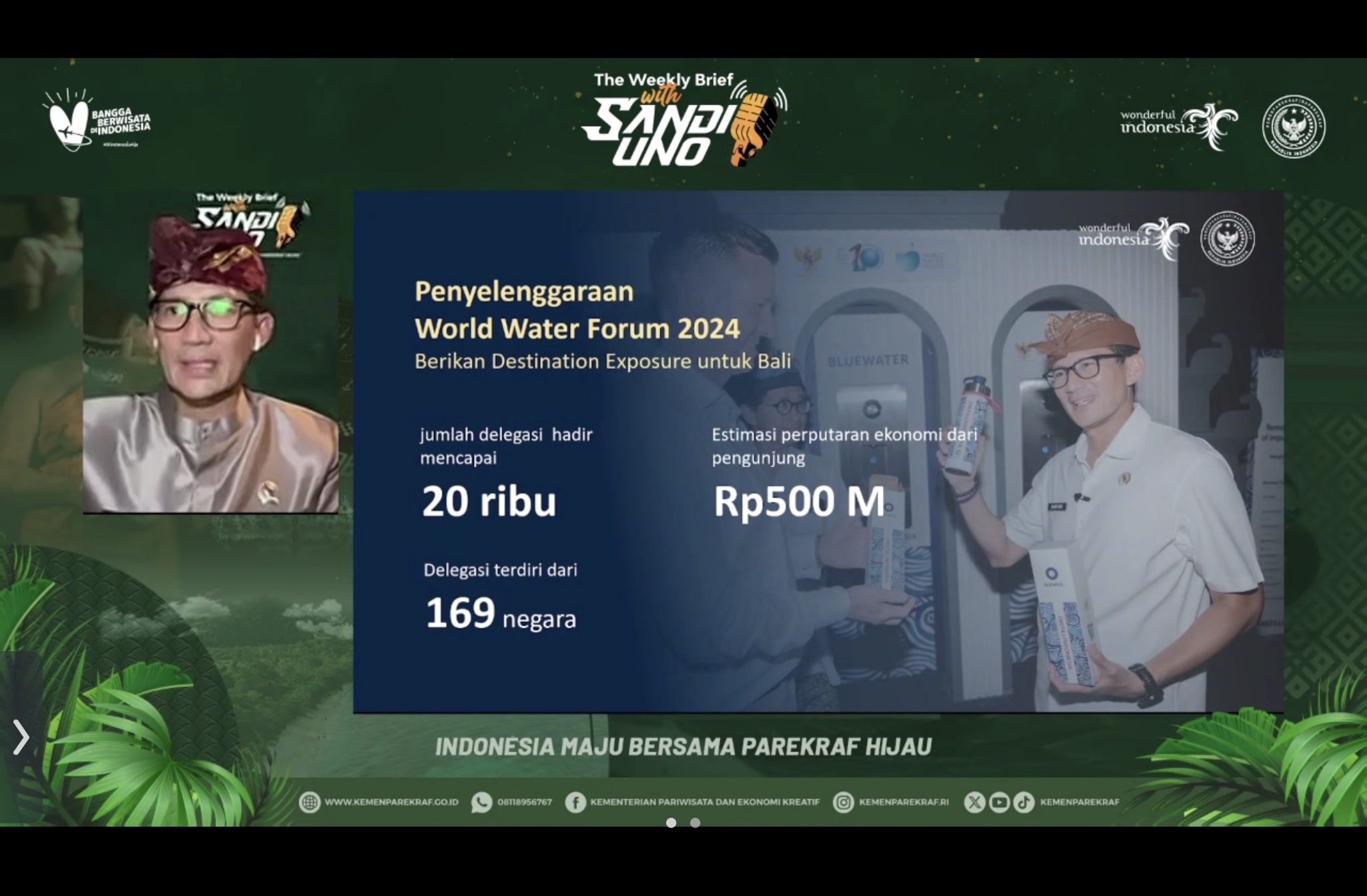 “Sebanyak 50 ribu wisatawan diperkirakan datang ke bali dalam rangka World Water Forum ke 10 yang terdiri dari delegasi serta para pendampingnya. Ini memberikan destination exposure khususnya bagi Bali, dan bagi pariwisata Indonesia secara luas,” kata Menparekraf Sandiaga.