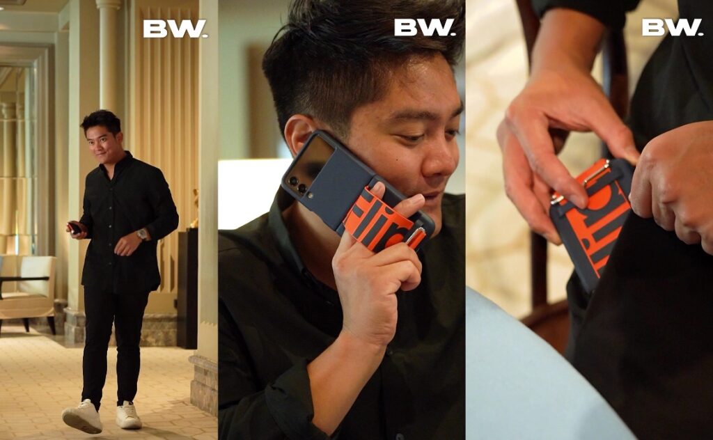 Tentunya pilihan fashion untuk dinner date berbeda dengan keseharian. Maka dari itu, Boy langsung fashion swap dengan kemeja hitam dan celana hitam yang classy lengkap dengan Galaxy Z Flip3 yang dibalut strap case favoritnya, yaitu casing navy blue dengan aksen strap warna orange berlogo Flip, sebagai fashion statement yang menunjang gaya berpakaiannya.